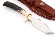 The Model 11 is the original drop-point blade. Designed by Tommy Thompson, noted Alaskan guide, in 1952 for big-game skinning, with point dropped below top of blade to prevent cutting too deeply through skins when used point first. This knife has a satin finished blade with notched thumbrest, .146" blade stock and 1.293" blade depth, hidden tang construction. The handle has a brass guard with stag grip and red/white/blue spacers. Comes with a brown leather sheath with sharpening stone. Has a couple oxidation spots on the blade, otherwise excellent condition.