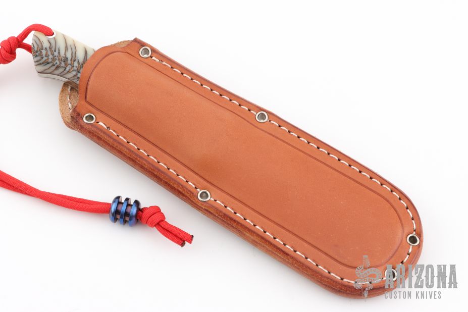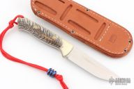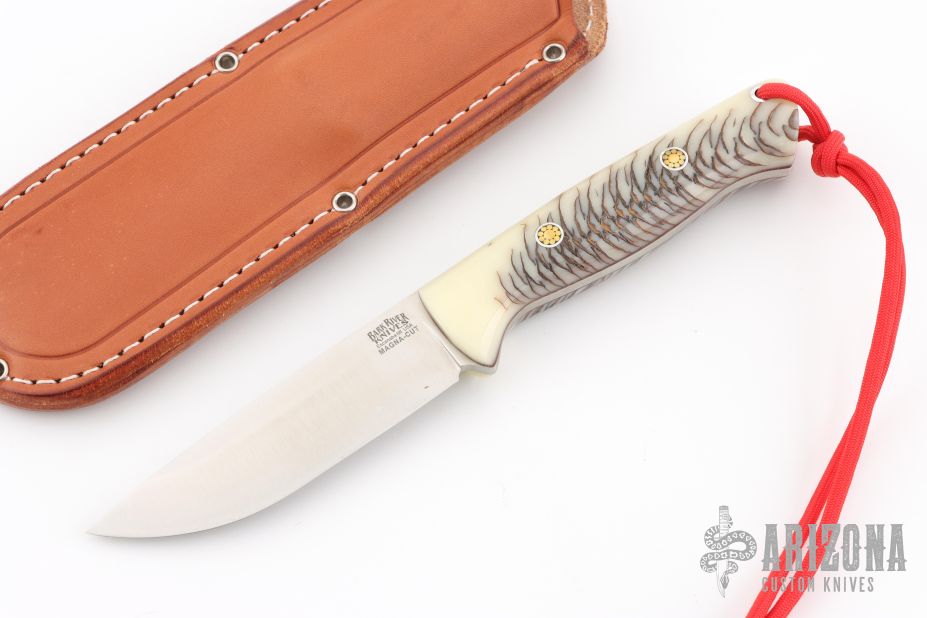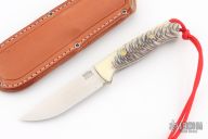 This Bravo-1 LT by Bark River Knives features a satin finished blade with .156" blade and 1.131" blade depth, full tang construction. The handle has black/white pinecone scales with mosaic pins. Comes with a brown leather sheath and original box. Excellent condition.