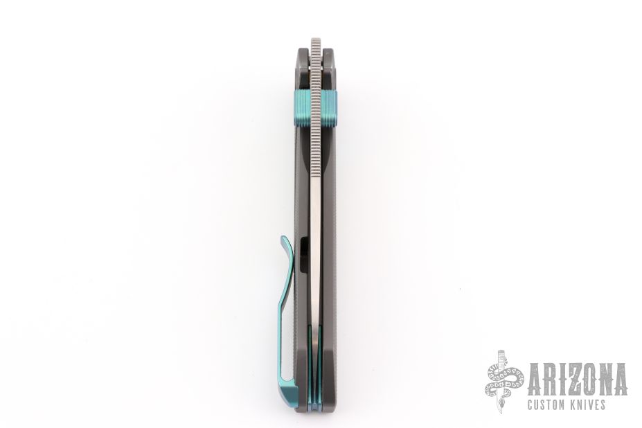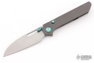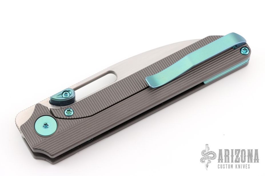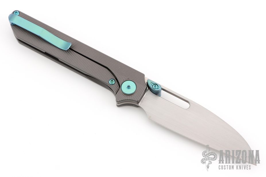This SLIM by Golden Designworks features a hand rub satin finished blade with thumbhole, dual thumbstuds and notched thumbrest. Works well as a front flipper. The handle has milled and smoke finished titanium scales, sage anodized titanium backspacer and tip up clip. Comes with original box, zippered case and papers. Excellent condition.