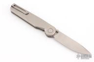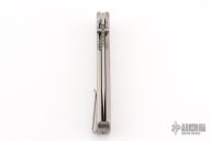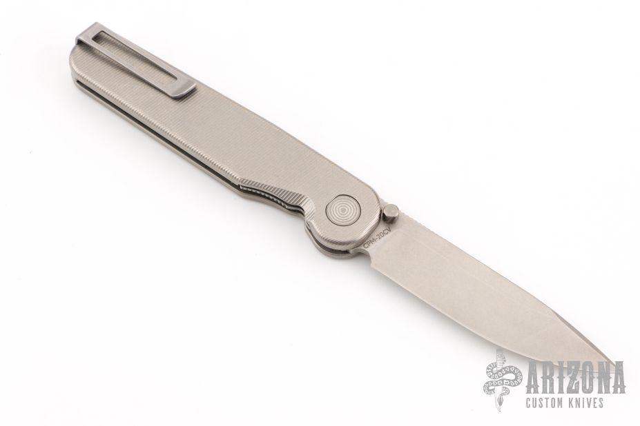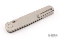 The Rockwall by Tactile Knife features a stonewashed 20CV blade with notched thumbrest and dual thumbstuds. The handle has a milled titanium frame with a tip up stainless steel clip and backspacer. Excellent condition.