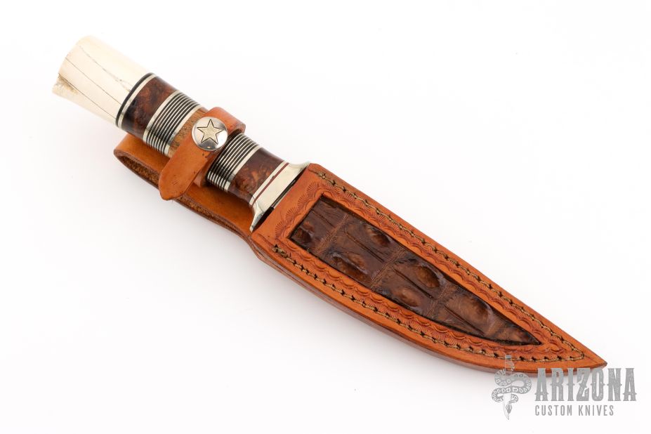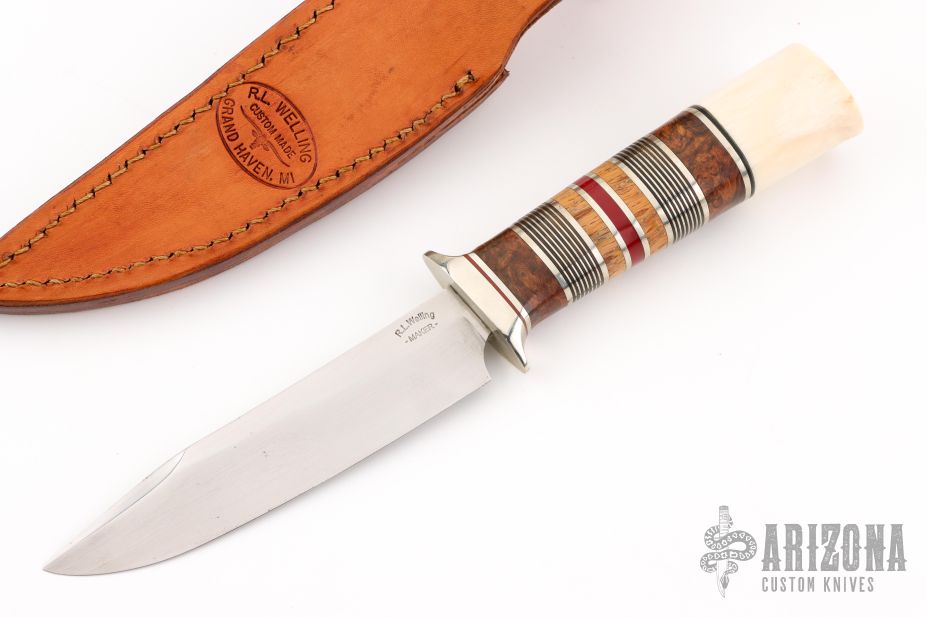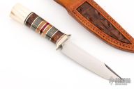 This hunter by RL Welling features a hand rub satin finished blade with false top edge, .180" blade stock and 1.034" blade depth, hidden tang construction. The handle has a nickel silver guard, mammoth ivory butt, and a spacer pattern of red/nickel silver/burl wood/black/black spacers. Comes with a hand tooled brown leather sheath with alligator skin inlay. Has some cracks in the butt, has a couple light scratches, otherwise good condition.
