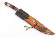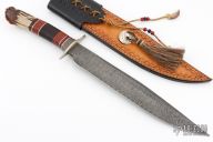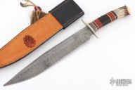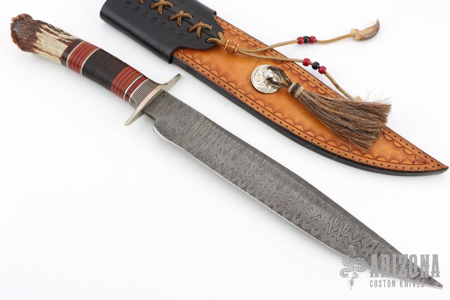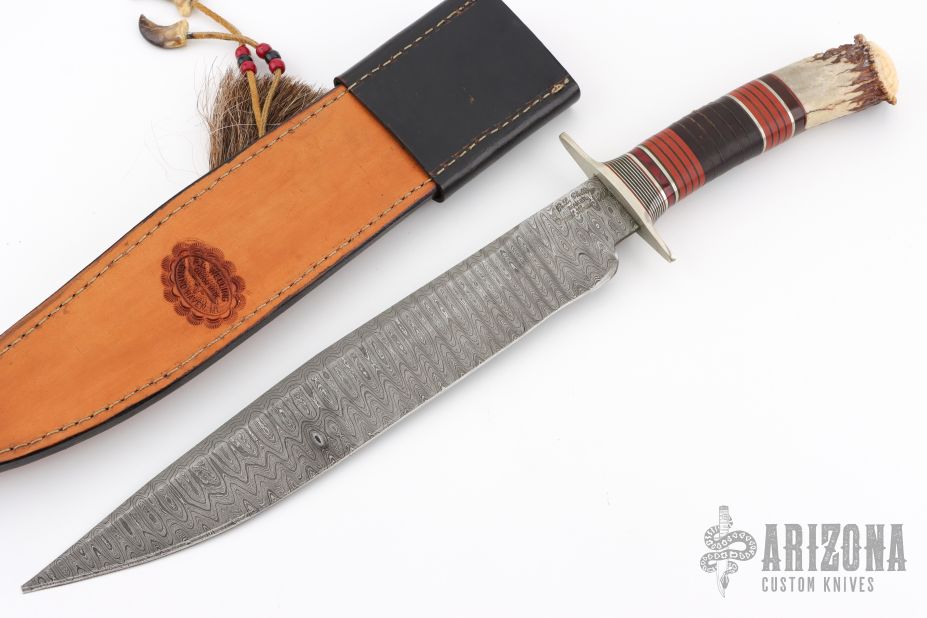 This Bowie from R.L. Welling features a Steve Schwarzer Damascus blade with nearly sharpened top edge, .194" blade stock and 1.863" blade depth, hidden tang construction. The handle has a nickel silver guard, crown stag butt, and a spacer pattern consisting of red/nickel silver/black/red jasper/stacked leather. Includes a hand tooled brown leather sheath with belt loop. Comes with a zippered case. The tip is broken off, has some patina, looks to have been resharpened, otherwise good condition.
