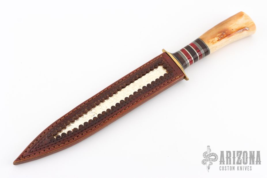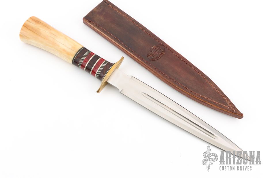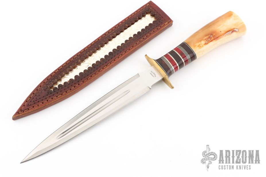 This Dagger by RL Welling features a satin finished double edged blade with fullers, .150" blade stock and 1.254" blade depth, hidden tang construction. The handle has a brass guard, walrus ivory grip, and a spacer pattern of black/nickel silver/ironwood/jasper spacers. Comes with a hand tooled brown leather sheath with engraved nickel silver inlay. Excellent condition. Comes with a zippered case.