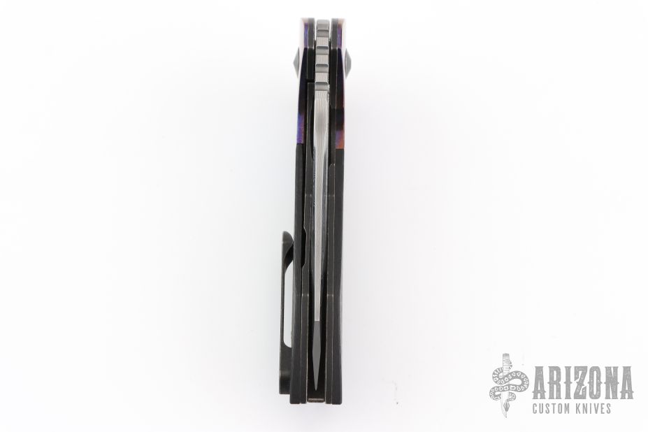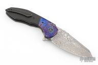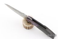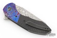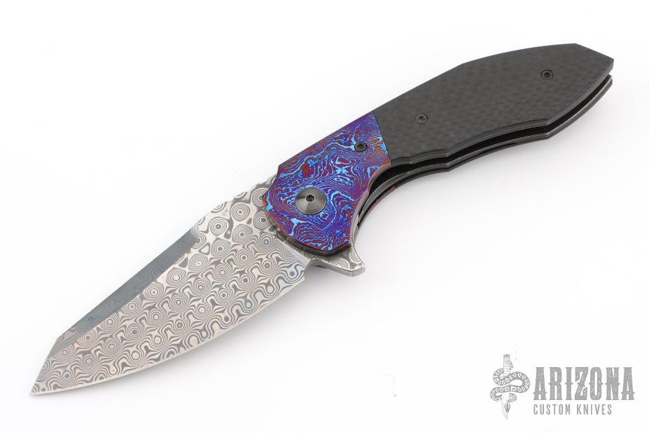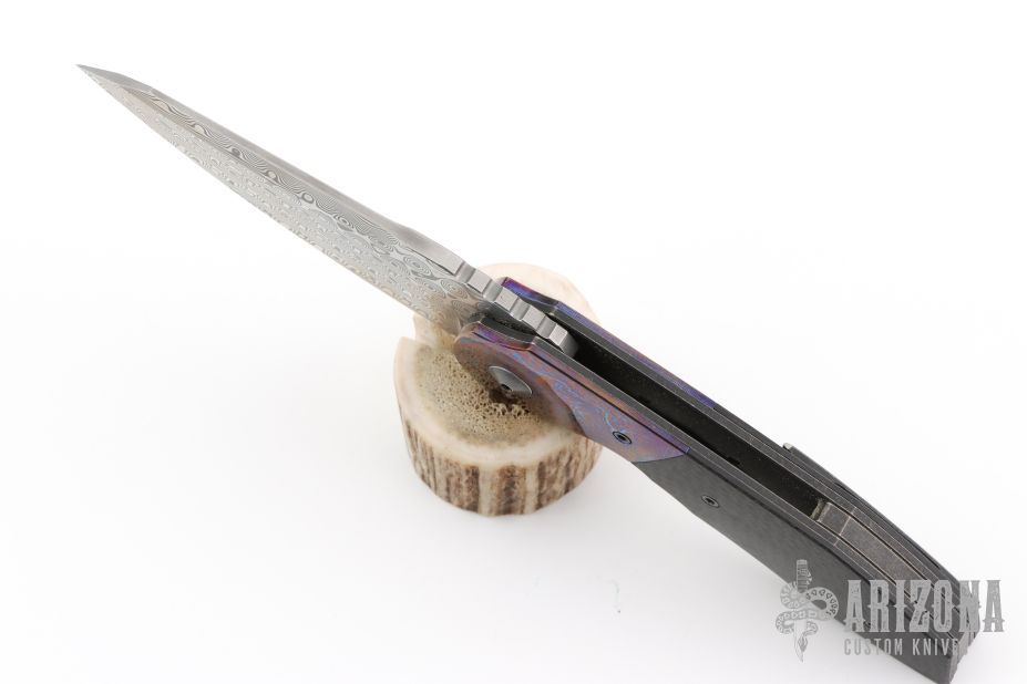 The Spectra, by Custom Knife Factory, features mokuti bolsters, carbon fiber scales, black tumbled titanium liners, backspacer and tip up clip. The Damasteel blade features a notched thumbrest and flipper. S/N 26. Includes original zipper case and cloth. Has a couple light scuffs, excellent condition otherwise.