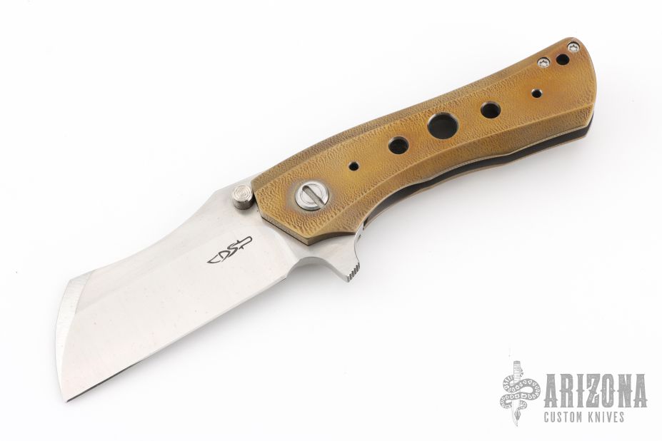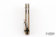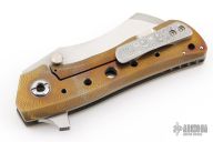 This Toucan by DaracSteel features a two-tone satin finished wharncliffe blade with dual thumbstuds and a checkered flipper. The handle has an orange peel finished titanium frame with backspacer and a Damasteel tip up pocket clip. Rides on bearings, nice detent, lockup and blade seating. Comes with box and COA 2017. Excellent condition.