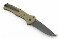 An explosive design, bound to take the battlefield by storm. The 9070SBK-1 Claymore is a slender push-button powerhouse, packed full of hidden features and inspired by one of the most notorious directional mines. Incorporating this air-hardening tool steel to Benchmade’s portfolio of premium materials, the Claymore blade has been crafted from CPM-D2 to provide ample toughness and edge retention. Manufactured in the USA, the Claymore has set the standard for closed break strength, making this Benchmade's toughest folder to date. Comes with original box, papers, and drawstring pouch. Excellent condition.