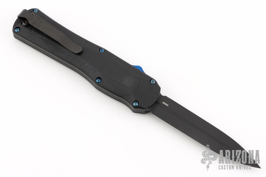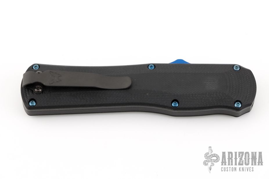 This Autocrat model has a black G-10 handle and a black finished dagger blade. The Autocrat is the first OTF offering from Benchmade featuring a milled composite G-10 handle. It is a high performance tactical auto, defined by both speed and style. The ergonomic handle successfully blends the durability and wear resistance of G-10, with the flashy style of blue sapphire titanium coated hardware and components. Item comes complete with a reversible deep-carry pocket clip. Features: Spine-fire release OTF automatic action for rapid, one-hand deployment. Reversible tip-down pocket clip allows for left or right side ambidextrous carry. Premium CPM-S30V double-edge dagger blade provides excellent strength and edge retention. Comes with original box and papers. Excellent condition.