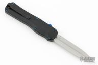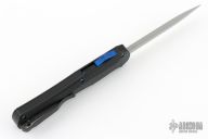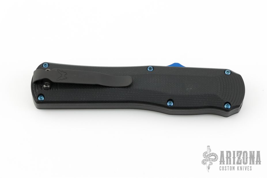 This Autocrat model has a black G-10 handle and a black finished dagger blade. The Autocrat is the first OTF offering from Benchmade featuring a milled composite G-10 handle. It is a high performance tactical auto, defined by both speed and style. The ergonomic handle successfully blends the durability and wear resistance of G-10, with the flashy style of blue sapphire titanium coated hardware and components. Item comes complete with a reversible deep-carry pocket clip. Features: Spine-fire release OTF automatic action for rapid, one-hand deployment. Reversible tip-down pocket clip allows for left or right side ambidextrous carry. Premium CPM-S30V double-edge dagger blade provides excellent strength and edge retention. Comes with original box and papers. Excellent condition.