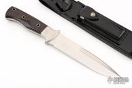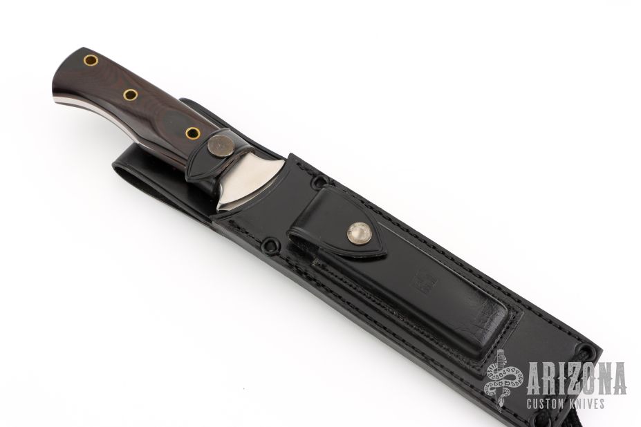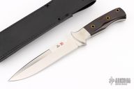 This SERE fixed blade from Al Mar Knives features a satin finished blade with false top edge, .199" stock and 1.373" depth, full tang construction. The handle has black/brown paper micarta scales, brass tube pins over red liners, stainless steel bolsters. Comes with original box, papers and black leather sheath. Has some light spotting on the blade, otherwise excellent condition.