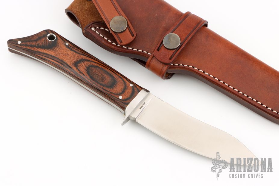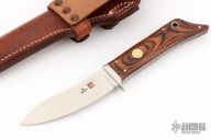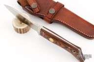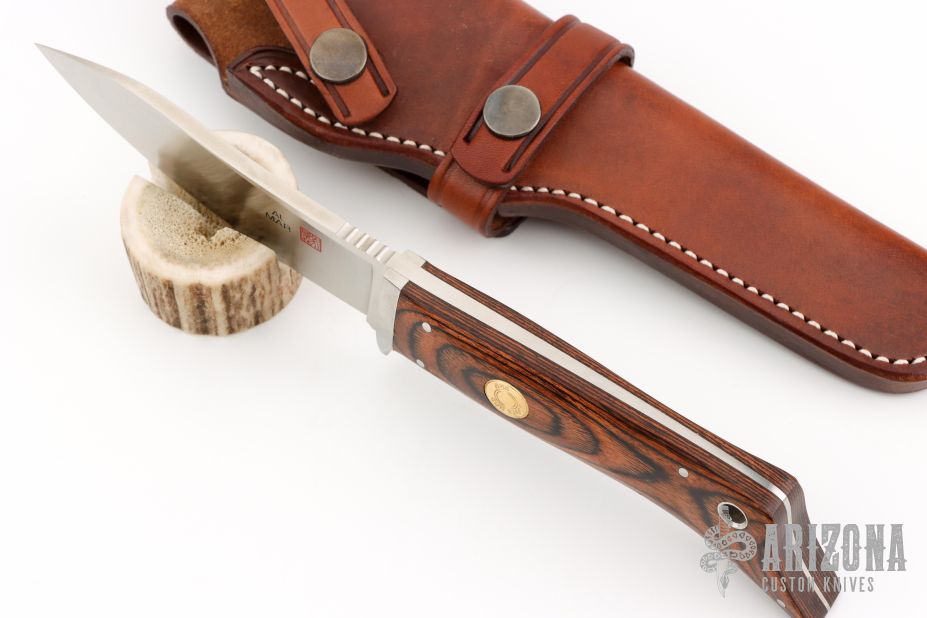 This Gunstock V features a satin finish blade with notched thumbrest, .196" blade thickness and 1.125" blade depth, full tapered tang construction. The handle has a stainless steel guard and dymondwood scales. Comes with original box and brown leather sheath. Has a couple very light scratches, otherwise excellent condition.
