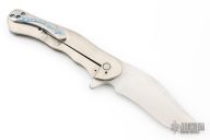 This custom framelock flipper by Matt Cucchiara features a hand rub satin finished clip point blade with a notched flipper. The handle has an anodized/carved titanium frame with matching tip up clip. Nice detent, lockup and blade seating. Cucchiara is engraved on the inside of the frame. Excellent condition. Comes with a Velcro case.