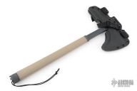 What sets the Shrike apart from other tools is the insulated rubber over-molded handle. The advantage of such a design is not only a great grip but vibration reduction and that fact that the handle is insulated. The Shrike has been tested to provide insulation up to 2,000 volts. If the tool is being used to chop through a wall and happens to connect with a live electrical wire, a good degree of protection exists from getting electrocuted. The butt end of the grip features a cap that screws off to gain access to a small storage compartment. We do sell a sharpening file that will fit the butt-cap, HERE The Shrike features a Tungsten Cerakote finish that offers corrosion resistance and a low-vis look. Included is a molded, bottom-eject kydex sheath and low-ride M.O.C. straps.