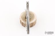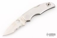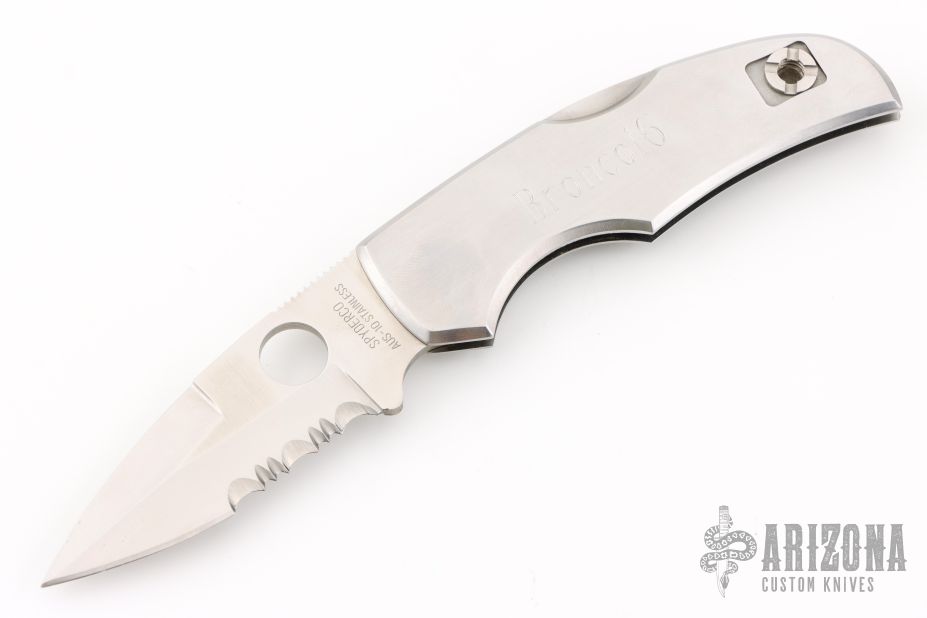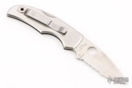 This Native II by Spyderco features a satin finished partially serrated blade with thumbhole and notched thumbrest. The handle has a stainless steel frame, clip and backspacer. Has some light scratches, good condition otherwise. Has "Broncol6" on the frame.