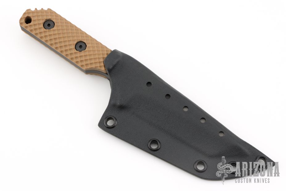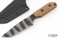 This DB-L from Strider Knives features a tanto blade with tiger stripe finish and notched thumbrest, .252" blade stock and 1.310" blade depth, full tang construction. The handle is comprised of brown G-10 gunner grip scales. Comes with a Kydex sheath. Excellent condition.