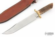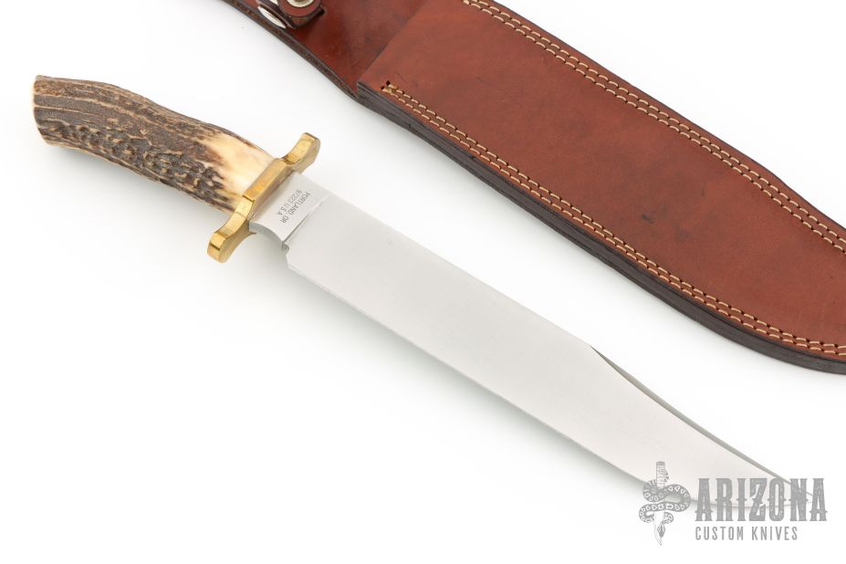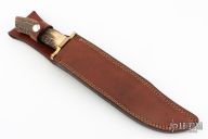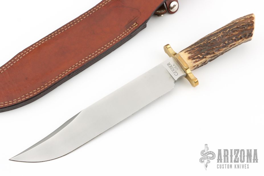 This Limited Edition Utility Bowie by Gerber features a satin finished blade with sharpened top edge, .303" blade stock and 1.509" blade depth, hidden tang construction. The handle has a brass guard and stag grip. Comes with a brown leather sheath. Has a few light scuffs, otherwise excellent condition.