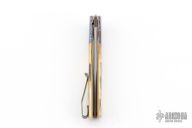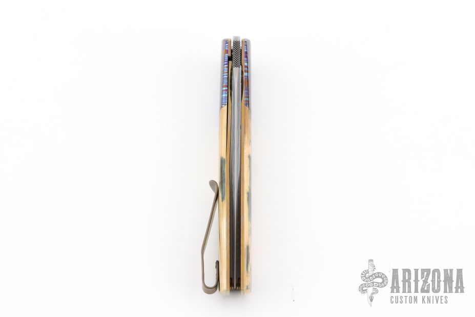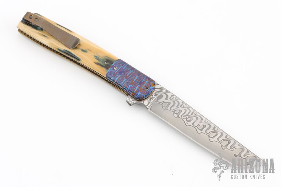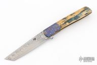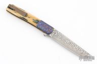 This Urban Trapper Flipper by Brad Zinker features a Damacore blade with checkered thumbrest and flipper. The handle has dovetailed Mokuti bolsters, mammoth ivory scales, anodized  titanium liners with laser engraved interiors and a tip up anodized titanium clip. Rides on bearings, nice detent, lockup and blade seating. Comes with zippered case. Excellent condition.