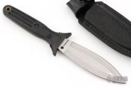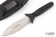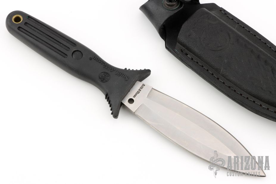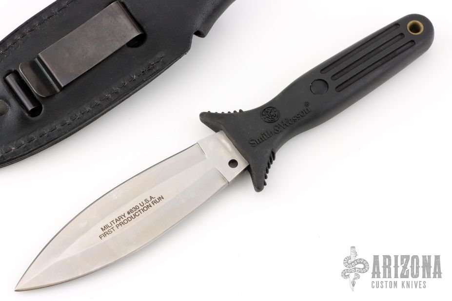 This dagger by Smith & Wesson features a double edged satin finished blade with .160" blade stock and 1.3" blade depth, hidden tang construction. The handle has a rubber grip and blade catch. Comes with a black leather boot sheath and original box. Has some light scuffs, excellent condition otherwise.