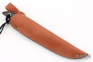 The belt Knife, by Grohmann Knives, features a satin finished blade with a notched thumbrest and a full tang construction, .113" Blade Stock and .996" Blade Depth. The handle is composed of pinned micarta scales. Includes a brown leather sheath and the original box and papers. Has a couple light scratches, otherwise excellent condition.