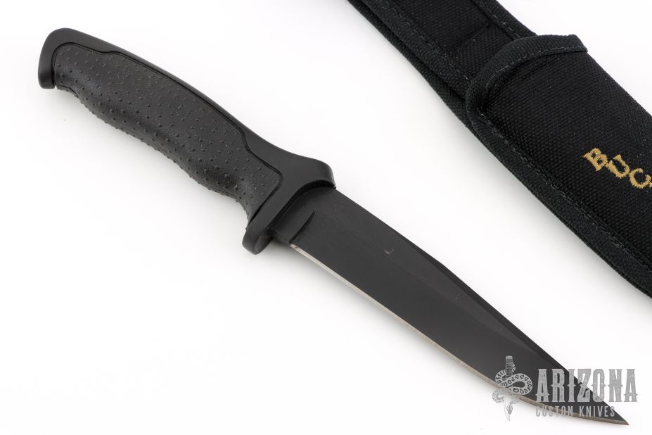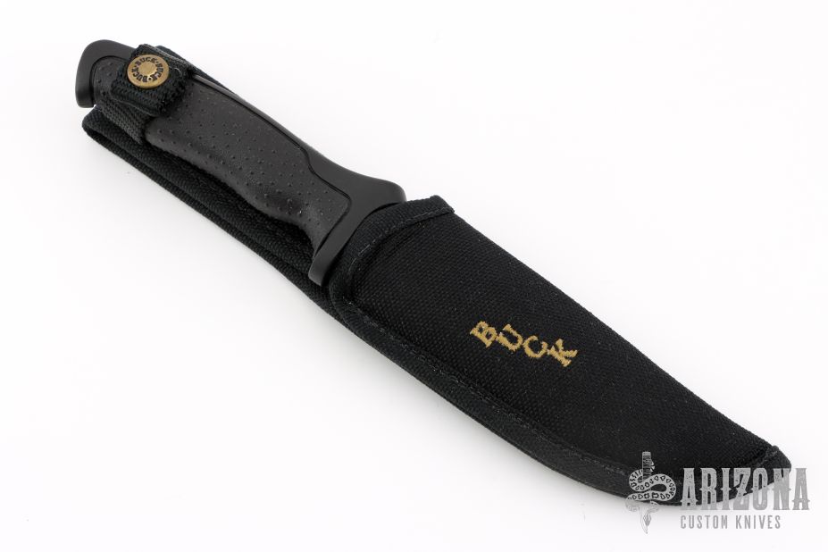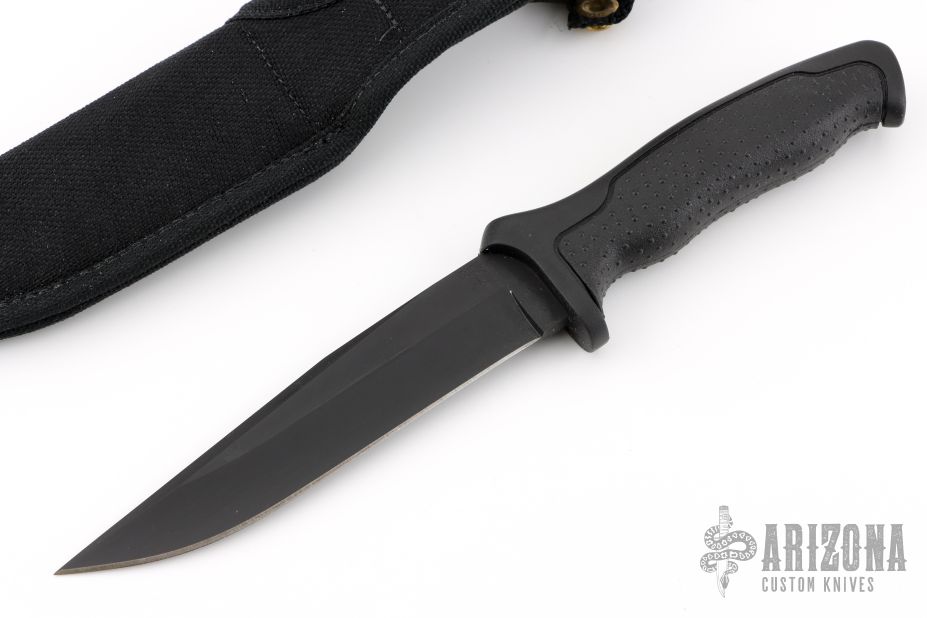 This Night Hawk by Buck Knives features a black clip point blade with false top edge, .235" blade stock and 1.239" blade depth, hidden tang construction with a rubber grip. Comes with original box, papers and black nylon sheath. Has some light scuffs and scratches, great condition otherwise.