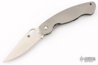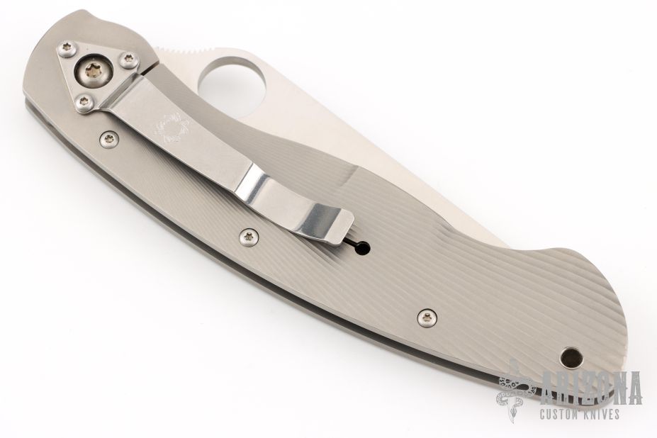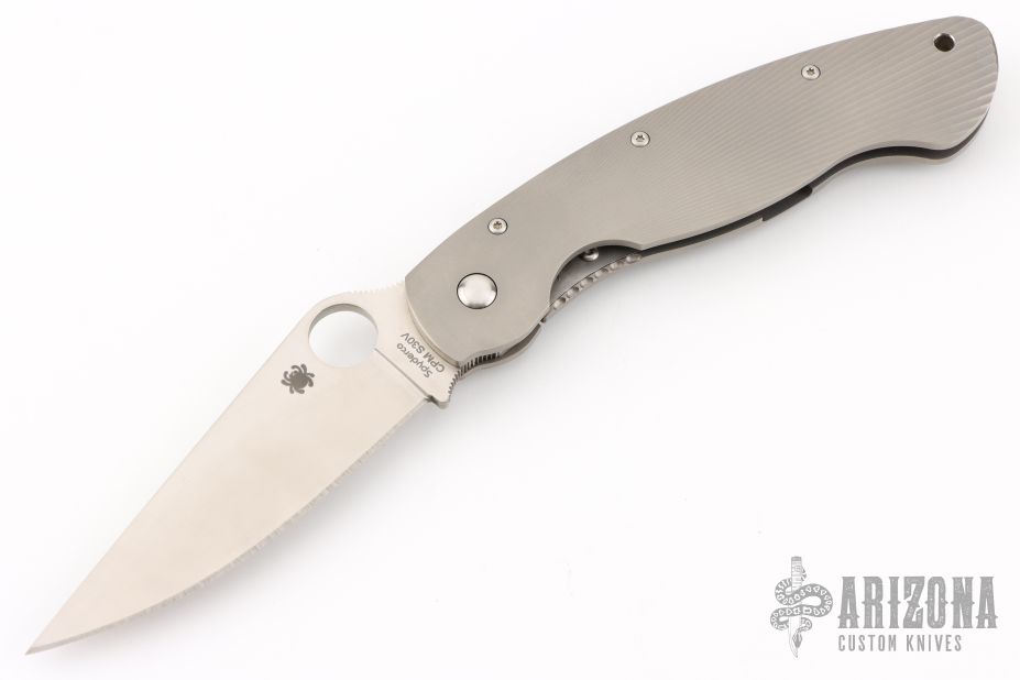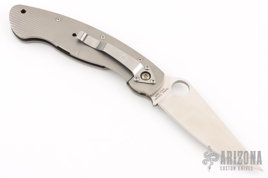 The Military folder from Spyderco has been in production since the 1990s in a variety of steels, materials and colors. This framelock Military folder has a satin finish S30V blade and a fluted and anodized titanium frame. Blade choil and thumbrest are jimped for better control. The oversized blade hole makes opening a natural and smooth action even if wearing gloves. Tip down carry. Comes with original box and papers. Excellent condition.