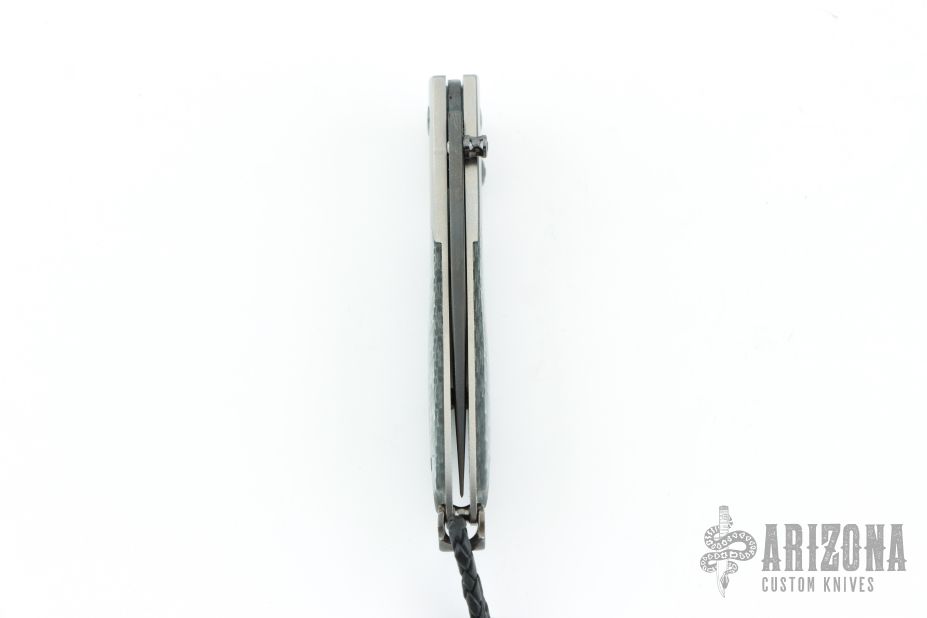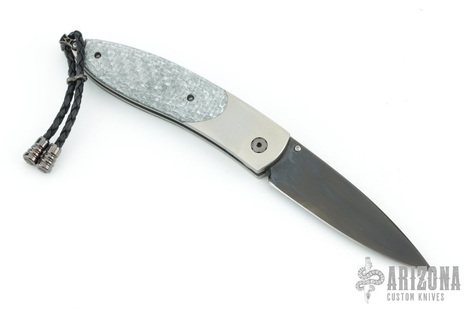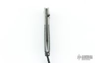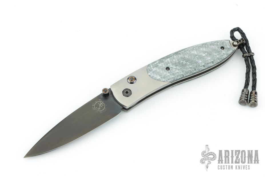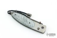This B05 Spector by William Henry features a black coated San Mai blade with ZDP-189 core, single thumbstud with a spinel inset, matching button lock. The handle has a titanium frame with silver twill inlays with sterling silver lanyard bail. Comes with original box, leather sheath and COA dated March 5, 2014. Excellent condition.