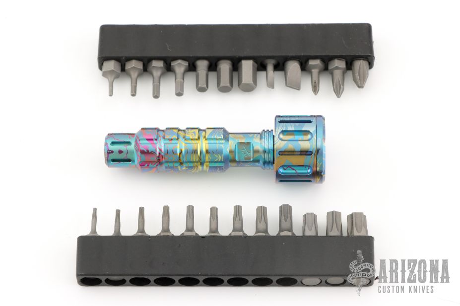 Anodized titanium bit driver with slots for tritium inserts. Comes with original box, papers, sticker and bit sets. Excellent condition.