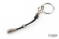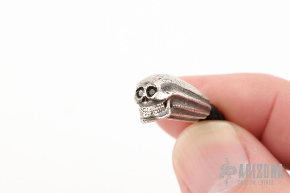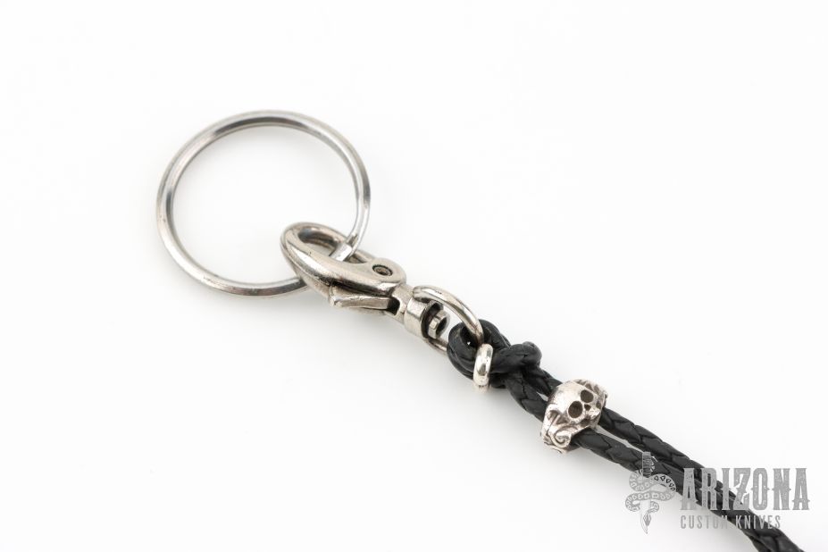 This fine William Henry key chain features a skull bead sculpted from sterling silver, with an antique patina and set with two black diamonds. The black leather lanyard is finished with a sterling silver skull ‘slider’, sterling knot retainer, and a black nickel-coated split ring and clasp.