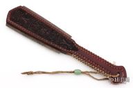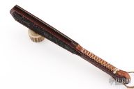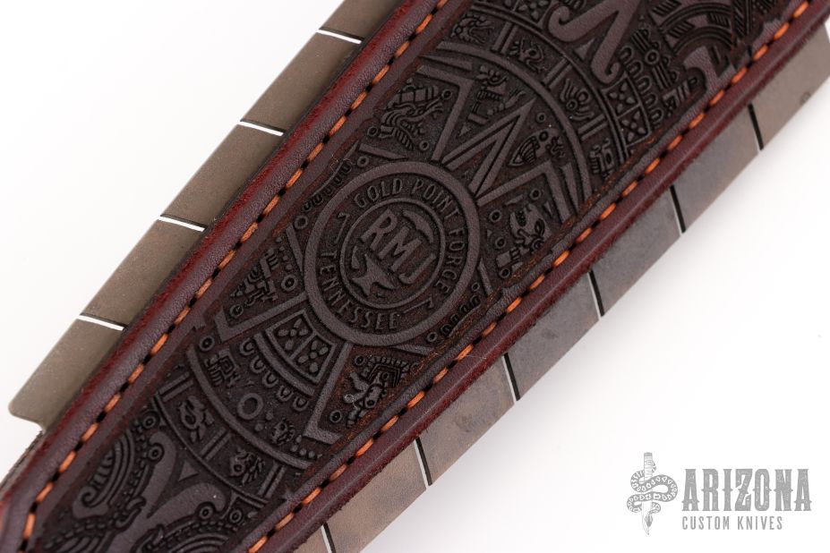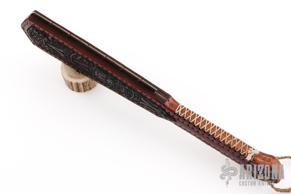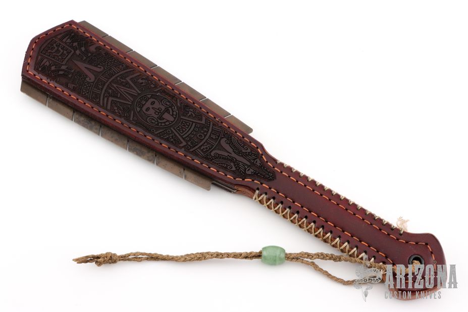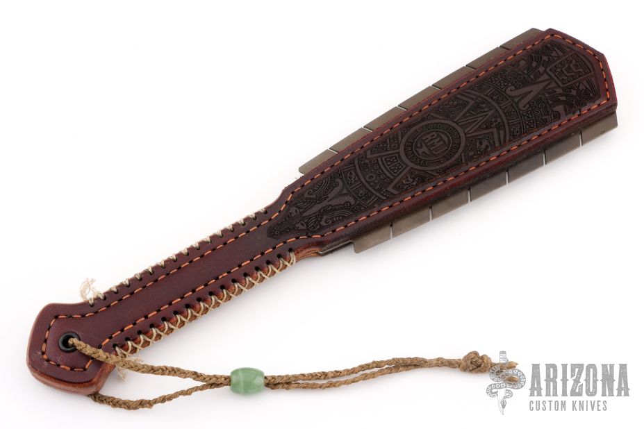Straight from Ryan's shop is his take on the Macuahuitl (don't ask us how to pronounce it) war club now in a smaller more easily carried Sap! Part sap, part sword, and part saw! Inspired by the Macuahuitl used by Mesoamerican cultures from the tenth to sixteenth century. Ryan took the theme and ran with it! His Aztec War Club Sap is constructed from premium cowhide with a lead and spring steel core and an intricate aztec calendar desin on the body. The main body tapers to a generous handle with extra cordage for a secure grip. On both sides of the sap body sit the gnarly saw-like blades! Each set is one singe piece of steel slotted into the body. These Aztec War Club Saps are not for the feint of heart! New condition. Comes with original box.