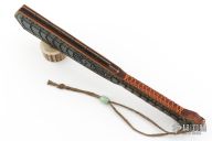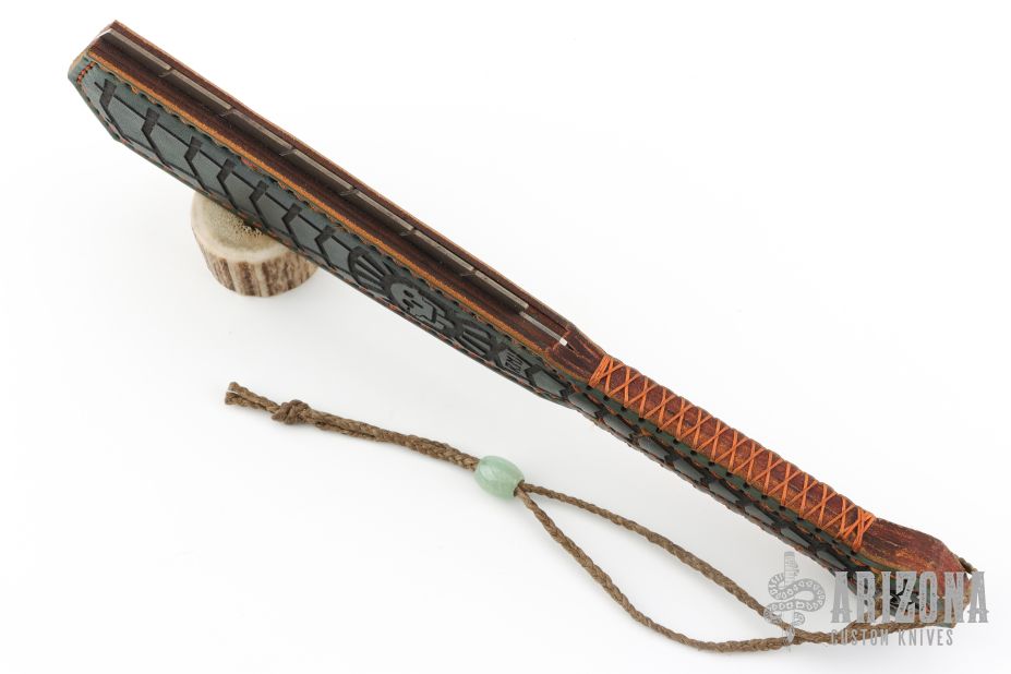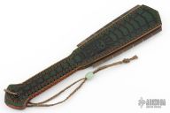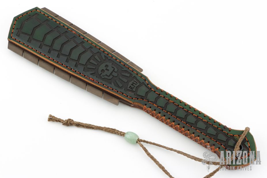 Straight from Ryan's shop is his take on the Macuahuitl (don't ask us how to pronounce it) war club now in a smaller more easily carried Sap! Part sap, part sword, and part saw! Inspired by the Macuahuitl used by Mesoamerican cultures from the tenth to sixteenth century. Ryan took the theme and ran with it! His Aztec War Club Sap is constructed from premium cowhide with a lead and spring steel core and an intricate death god design on the body. The main body tapers to a generous handle with extra cordage for a secure grip. On both sides of the sap body sit the gnarly saw-like blades! Each set is one singe piece of steel slotted into the body. These Aztec War Club Saps are not for the feint of heart! New condition. Comes with original box.