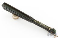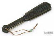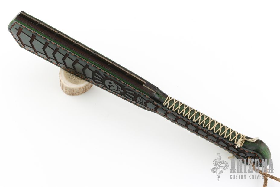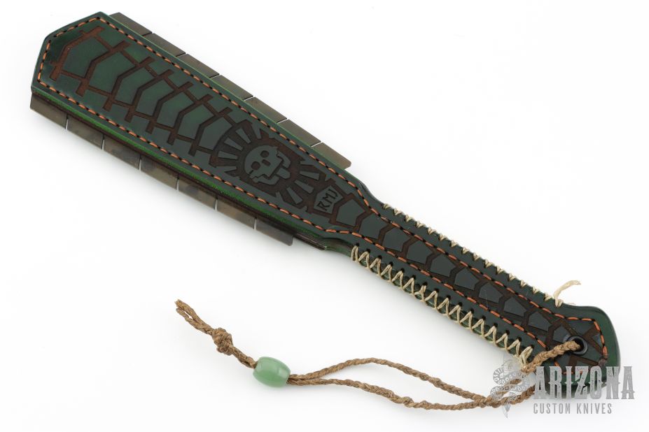 Straight from Ryan's shop is his take on the Macuahuitl (don't ask us how to pronounce it) war club now in a smaller more easily carried Sap! Part sap, part sword, and part saw! Inspired by the Macuahuitl used by Mesoamerican cultures from the tenth to sixteenth century. Ryan took the theme and ran with it! His Aztec War Club Sap is constructed from premium cowhide with a lead and spring steel core and an intricate death god design on the body. The main body tapers to a generous handle with extra cordage for a secure grip. On both sides of the sap body sit the gnarly saw-like blades! Each set is one singe piece of steel slotted into the body. These Aztec War Club Saps are not for the feint of heart! New condition. Comes with original box.