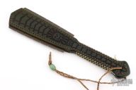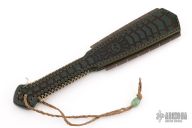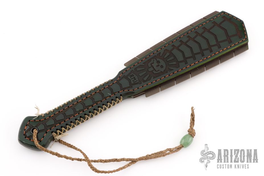 Straight from Ryan's shop is his take on the Macuahuitl (don't ask us how to pronounce it) war club now in a smaller more easily carried Sap! Part sap, part sword, and part saw! Inspired by the Macuahuitl used by Mesoamerican cultures from the tenth to sixteenth century. Ryan took the theme and ran with it! His Aztec War Club Sap is constructed from premium cowhide with a lead and spring steel core and an intricate death god design on the body. The main body tapers to a generous handle with extra cordage for a secure grip. On both sides of the sap body sit the gnarly saw-like blades! Each set is one singe piece of steel slotted into the body. These Aztec War Club Saps are not for the feint of heart! New condition. Comes with original box.