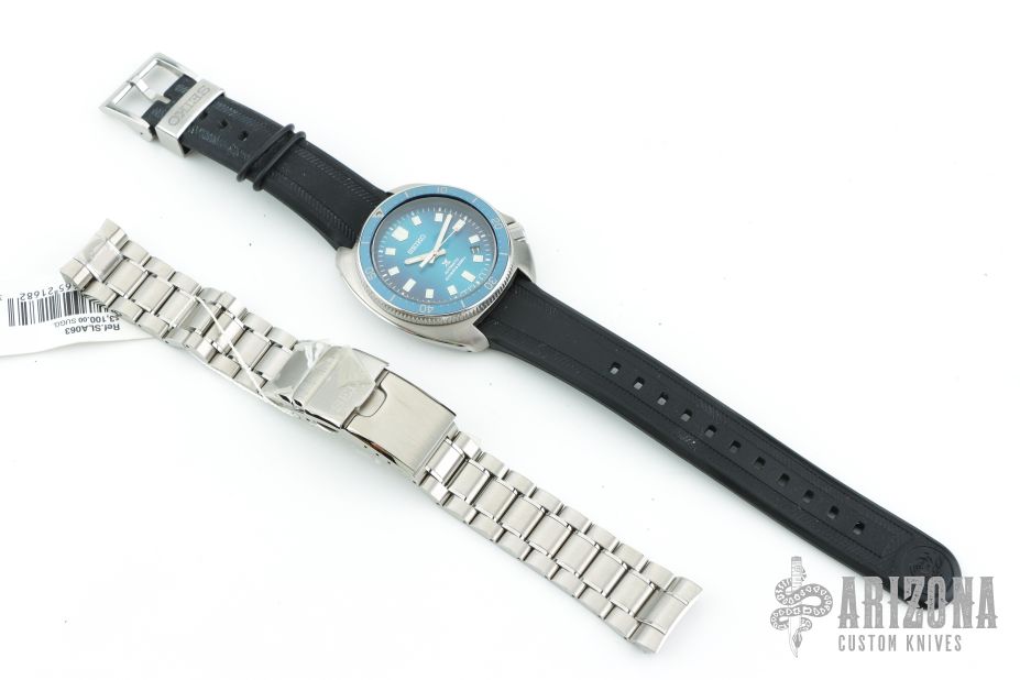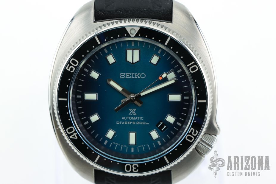 1970 Diver's Watch Modern Re-Interpretation Limited Edition. Designed for those who treat life as the ultimate adventure, the Seiko Prospex line meets every challenge with technological excellence and style. Part of a rich legacy of innovation in high-intensity timekeeping, Prospex continues to celebrate a long history of sports watch excellence with re-creations and re-interpretations of landmark achievements. Inspired by the Aurora Borealis or Northern Lights, with a subtly gradated dial pattern evoking the changing colors of the night sky, this exceptional limited edition is available only in a controlled-production run of 500, with the serial number engraved on each caseback. Re-interpreting Seiko's renowned 1970 diver's watch, a favorite of such daring adventurers as Naomi Uemura, the first person to reach the North Pole solo, this extraordinary timepiece offers updated technology and a durable stainless steel case and bracelet with super hard coating. The caliber 8L35 26-jewel automatic movement, hand-assembled at Seiko's Shizukuishi watch studio with the increased torque necessary for smooth operation of the enlarged diver's watch hands, beats at a frequency of 28,800 vibrations per hour, with a power reserve of approximately 50 hours, and provides manual winding capability. Following ISO standards for scuba diving to depths of up to 200 meters, this superbly functional watch includes a date calendar, LumiBrite markers and hands for enhanced legibility, a curved sapphire crystal with anti-reflective coating on the inner surface, screwdown crown and caseback, blue uni-directional rotating elapsed timing bezel and tri-fold push button release clasp with secure lock and extender, as well as an additional black silicone strap. Packaged in a Limited Edition collectors' box. 200m Water Resistant