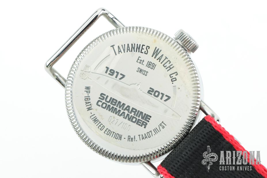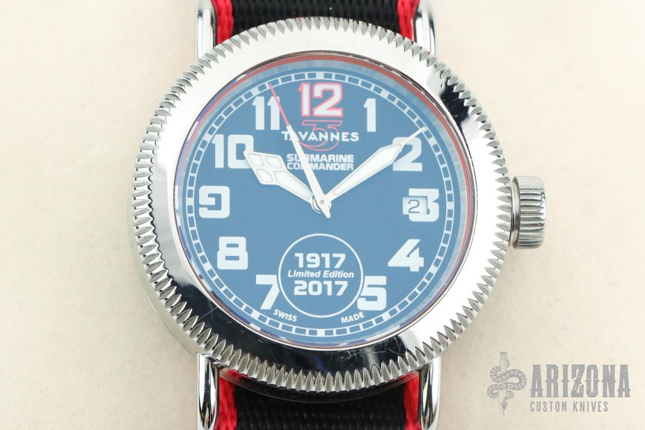 Tavannes produced the first water proof Divers watch in 1917 at the request from the British Royal Navy. To commemorate the 100th year anniversary, Tavannes produced the SUBMARNE COMMANDER Limited Edition of 100 pieces; THIS is No. 27/100. It is polished, 41mm case, powered by a Swiss automatic movement, screw down crown, sapphire crystal, and date indicator. The sporty black dial is stamped with “1917-2017 Limited Edition”. The case back is engraved with an image of a submarine limited edition number of the watch, and 1917-2017. It is available on a sporty black color with red trim accents Nato canvas strap. Comes with an additional red/black NATO strap.