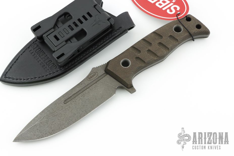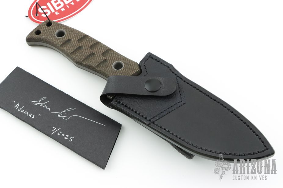 This Custom Adamas by Shane Sibert features an acid tumble finished blade blade with false top edge, fullers and notched thumbrest, .186" blade stock and 1.582" blade depth, full tang construction. The handle has green canvas micarta scales with hollow tube pins and black liners. Comes with a zippered case, patch and COA dated 7/2025. New from maker at the 2025 Pacific Northwest Custom Invitational.