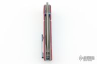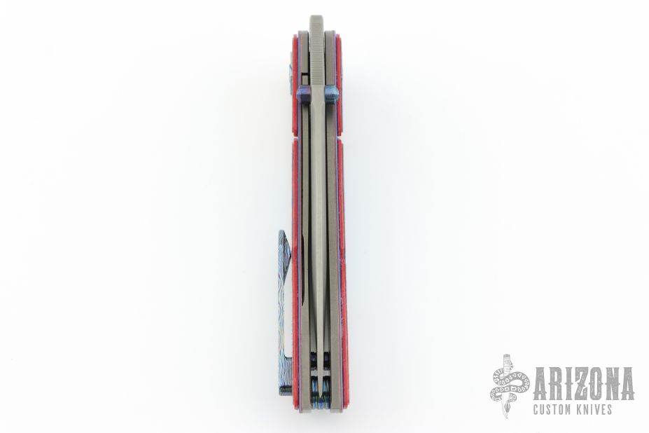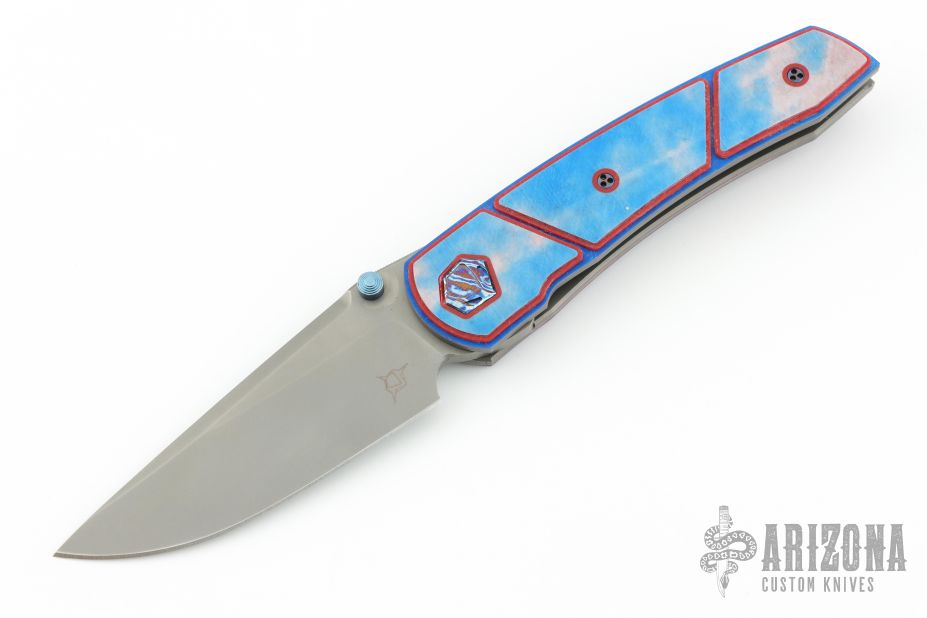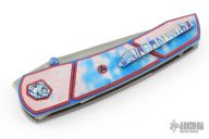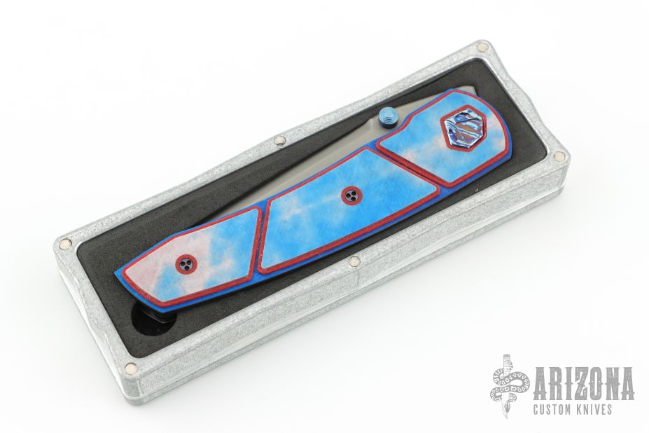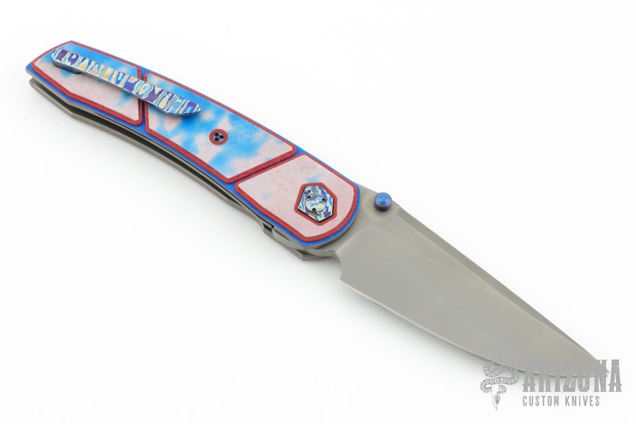This Waka by Edison Barajas features a blasted blade with notched thumbrest and dual thumbstuds, can be front flipped. The handle has a 3-layer CamoQuartz scales and blasted titanium frame.  Timascus pivot, pocket clip and stand-offs.   Rides on bearings, nice detent, lockup and blade seating. Comes with COA, dated 06-25. New from maker!