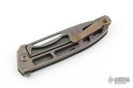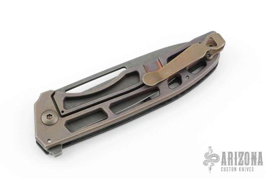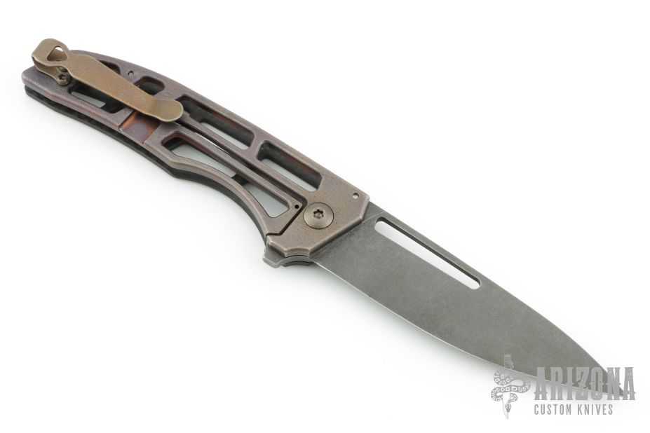 This Slitter from John Gray Knives features an acid etched drop point blade with a flipper. The handle has a ported carbon fiber and anodized bark finished titanium frame with orange peel tip up clip. Nice detent, lockup and blade seating. Comes with padded pouch.  New from maker!