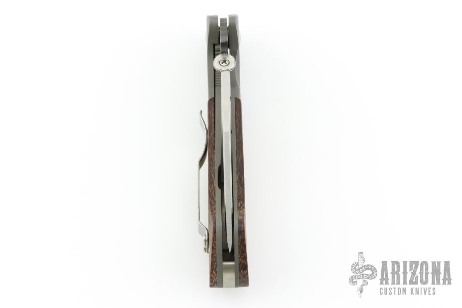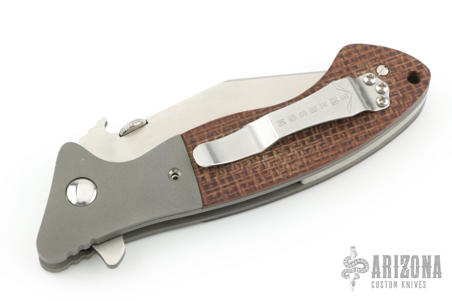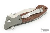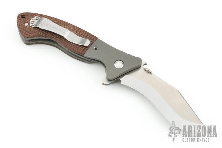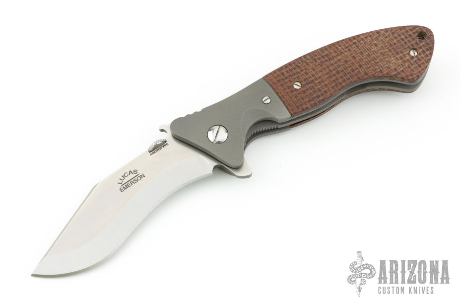 This MX-200 by Lucas Emerson features a satin finished recurve blade thumbdisc, wave and notched thumbrest, flipper. The handle has micarta scales, titanium liners, stainless steel tip up clip. Nice detent, lockup and blade seating.  Missing a screw.  Excellent Condition.