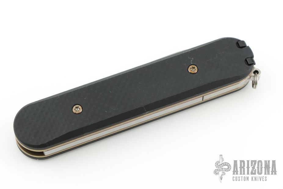 This Switch Army Switchblade by Chuck Gedraitis features a satin finished blade. The handle has black checkered aluminum scales, anodized titanium liners, stainless steel backspacer with titanium lanyard hole. Has tweezers and toothpick like a Swiss Army Knife. Nice action, lockup and blade seating. Comes with zipper case and COA dated 2025. New from maker at the 2025 Pacific Northwest Custom Invitational.