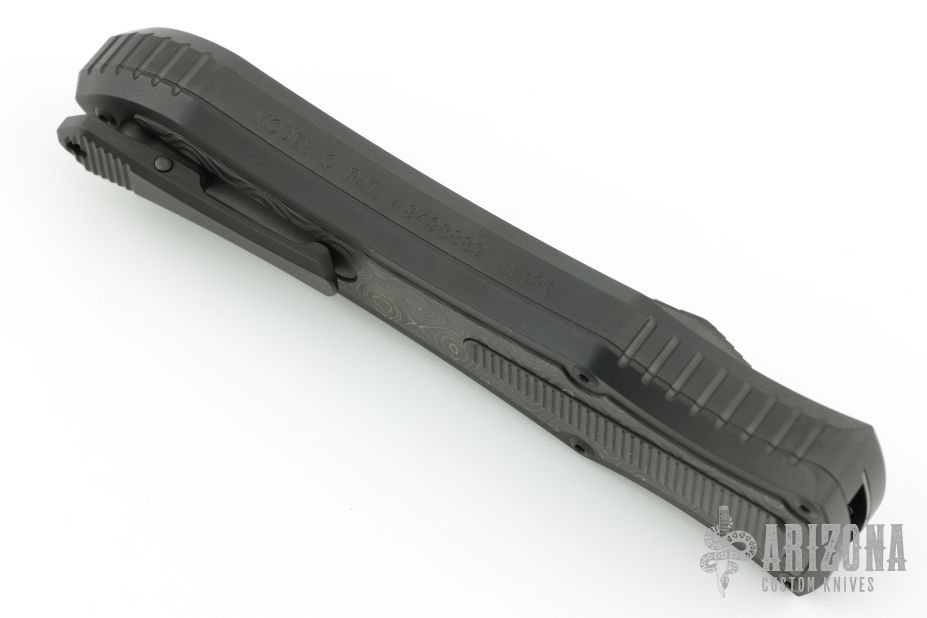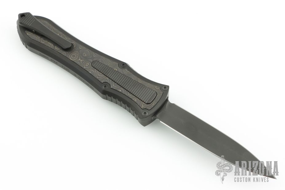 This knife is a Deadlock Model C by Grant and Gavin Hawk. It has a double-edged blade. The handle has a Fat Carbon inlays in the DLC titanium frame with a tip down spring clip, titanium. The thumb slide on the handle is also DLC titanium. Comes with original zippered case, tool and card. Grant and Gavin Hawk set out to create a double action OTF with no blade play.... They did it, NO blade play. New from maker at the 2025 Pacific Northwest Custom Invitational.