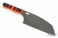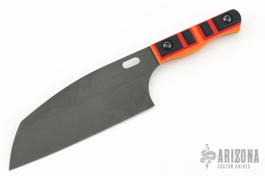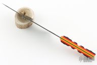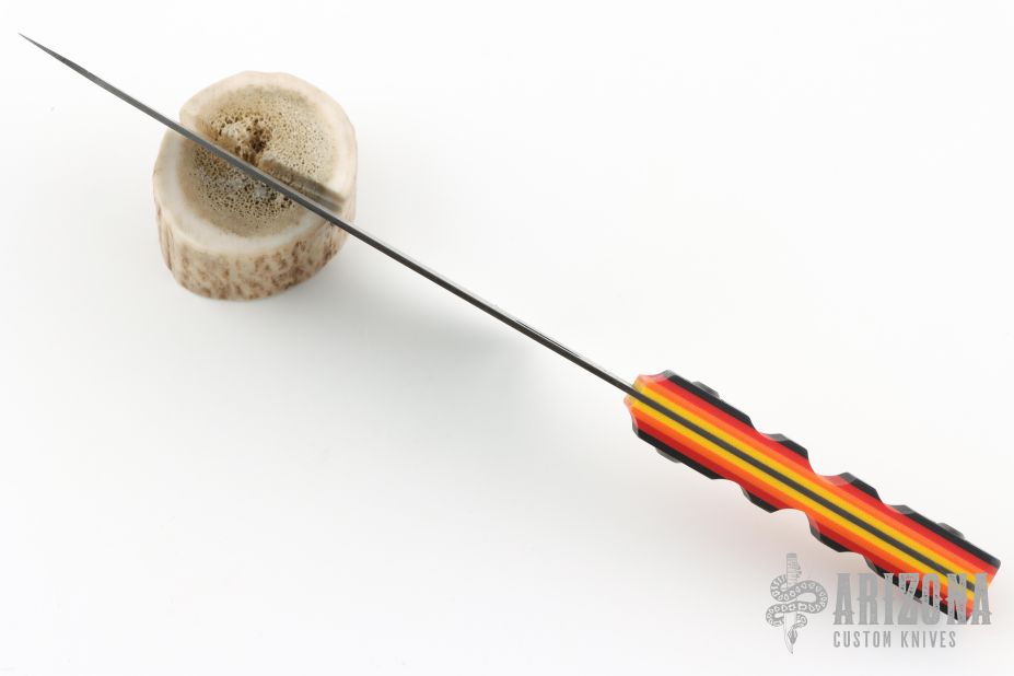 This knife by Jeremby Horton features a black blade with polished edge, .056" blade stock and 2.007" blade depth, full tang construction. The handle has black/red/orange/yellow scales. New from maker at the Pacific Northwest Custom Invitational.