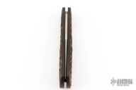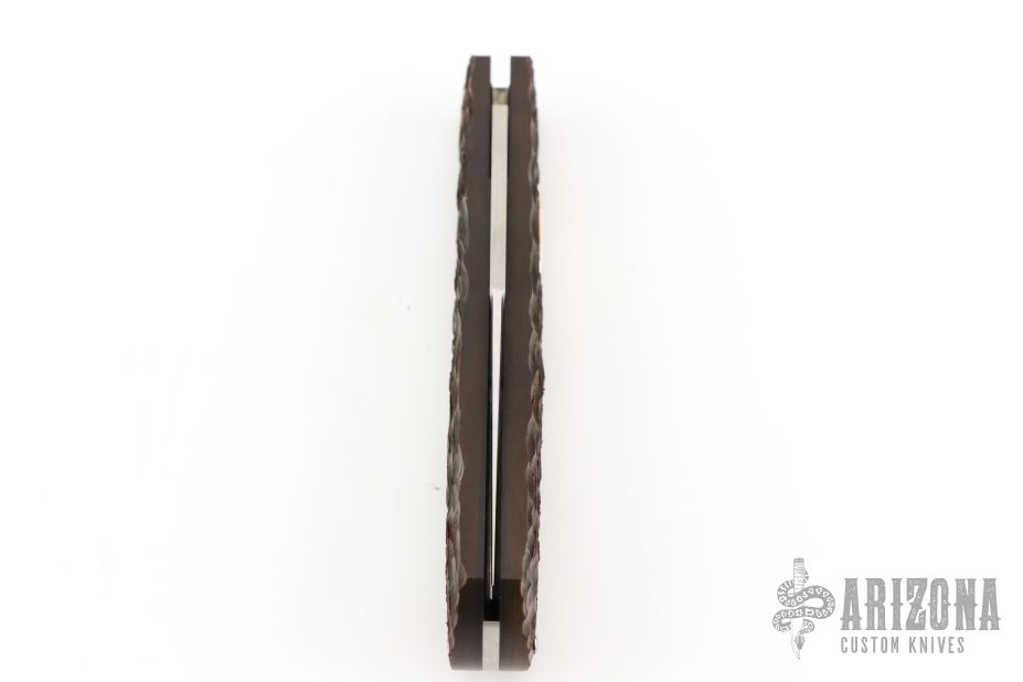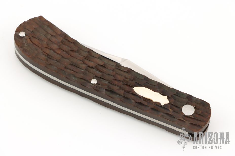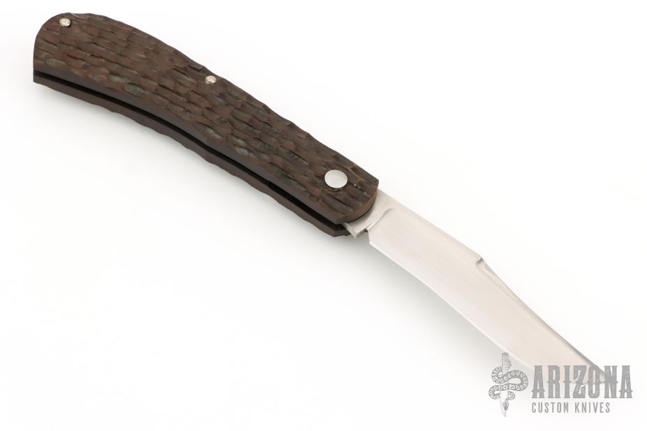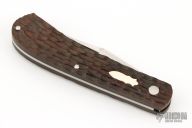 This Linerless Trapper by Luke Swenson features a hand rub satin finished clip point blade with swedge and nail nick. The handle has jigged brown paper micarta covers, mammoth ivory escutcheon, stainless steel spring. Has half-stop, flush in all positions. Comes with zippered case. New from maker at the Pacific Northwest Custom Invitational.