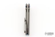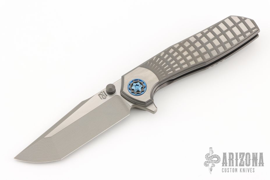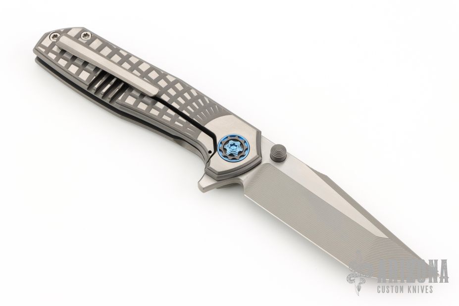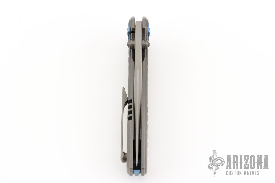 This Ragnarok V7 by Nick Chuprin features a two-tone harpoon milled blade with dual thumbstuds and flipper.  The handle has a milled Gunmetal Gray S/F finished titanium frame with a matching tip up clip with hidden screws, anodized titanium backspacer and pivot collar. Nice detent, lockup and blade seating. Comes with a zippered case and COA. S/N 4. New from maker at the 2025 Pacific Northwest Custom Invitational.