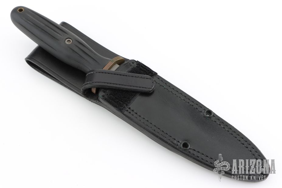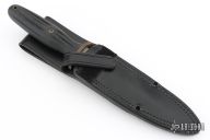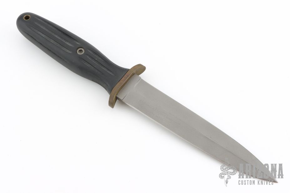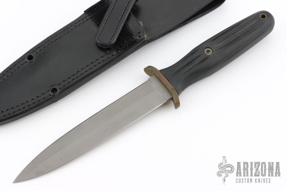 This Applegate/Fairbairn Combat Fighting knife is a serialized version made by Bill William W Harsey, it is #1193, he started this run with 154cm at s/n 1000. It features a hand ground bead blasted double edged blade, .192" blade stock and 1.115" blade depth, hidden tang construction. The handle has a brass guard with a black lexan handle. Comes with black leather sheath. "William W. Harsey Maker" on b-side of blade. Has a couple light scuffs, otherwise excellent condition.