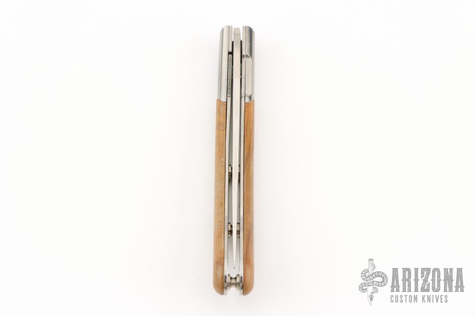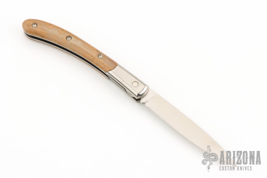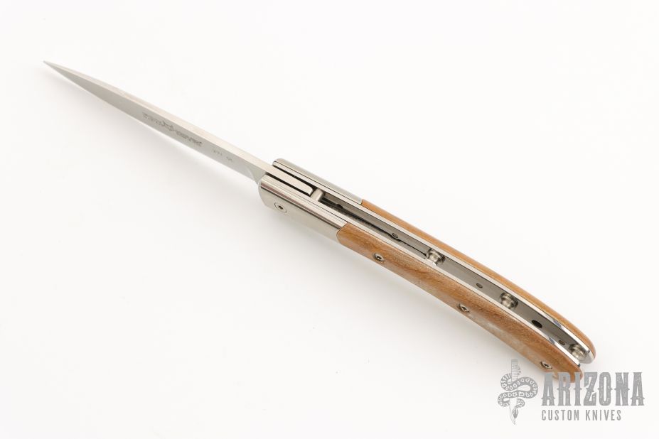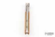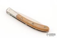 This knife features a satin finished drop point blade, with satin finished bolsters, wood covers, stainless liners, and standoffs. Comes in Fox Cutlery metal tin. Has a couple light scratches, excellent condition otherwise.