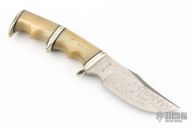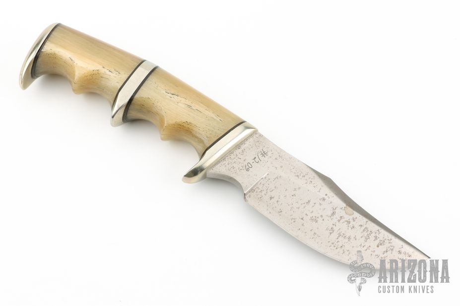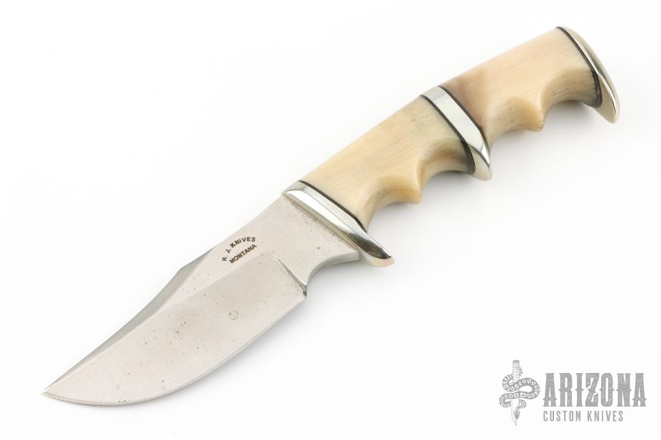 This hunter by RJ Knives features a satin finish blade, .249" blade thickness and 1.486" blade depth, hidden tang construction. The handle has a nickel silver guard and butt, sheep horn grip and black spacers. Comes with a zipper case. Has some patina, and light oxidation. there are also some light scratches, good condition otherwise. #12-09