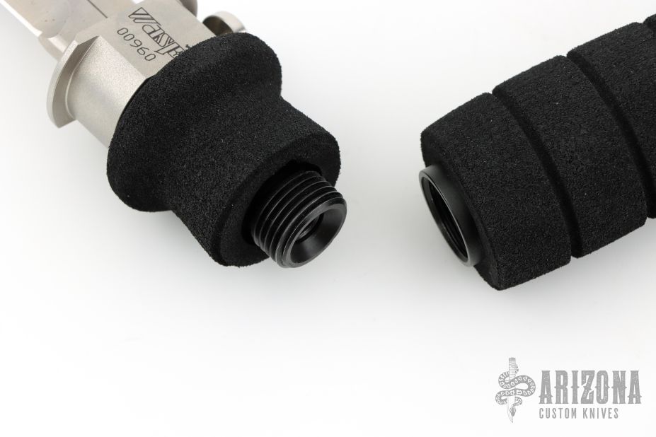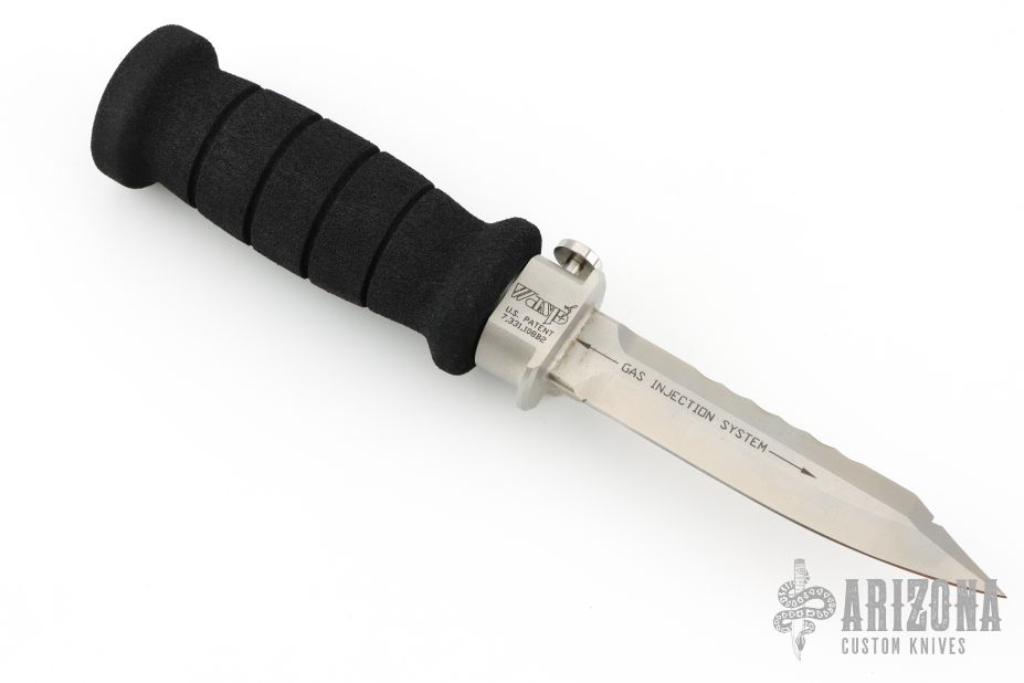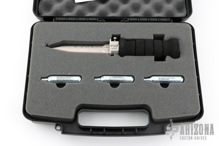 This Wasp scuba knife features a clip point blade with serrated spine, 1/4" blade stock and 1" blade depth, hidden tang construction. The blade has a gas injection system. The handle has a titanium guard with push button for CO2 release, and removable rubber handle where the CO2 cartridge is installed. Comes with original box, papers and 3 unused CO2 cartridges. Has some minor oxidation at the ricasso, otherwise excellent condition.