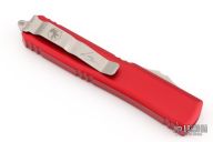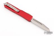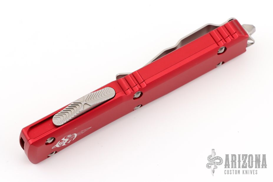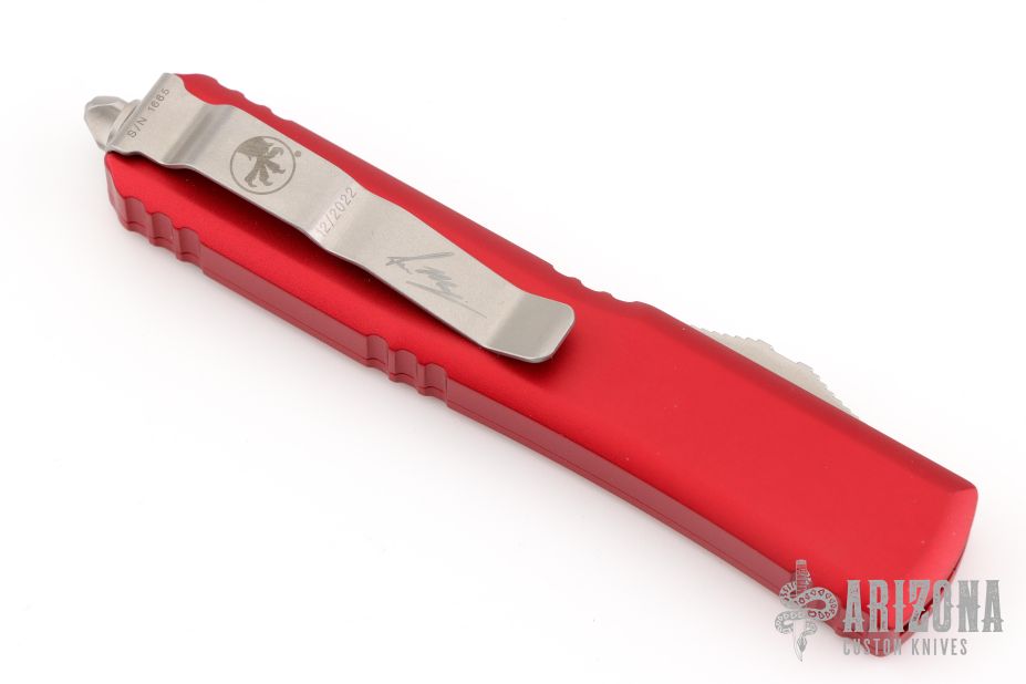 This Ultratech by Microtech Knives features a stonewashed Warhound blade with satin flats and false top edge. The handle has a red aluminum frame with tip down blasted stainless steel clip and hardware. Comes with original box and papers. 12/2022, S/N 1665. Excellent condition.