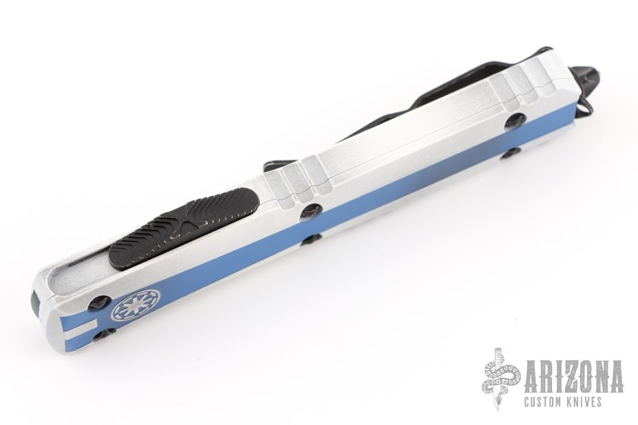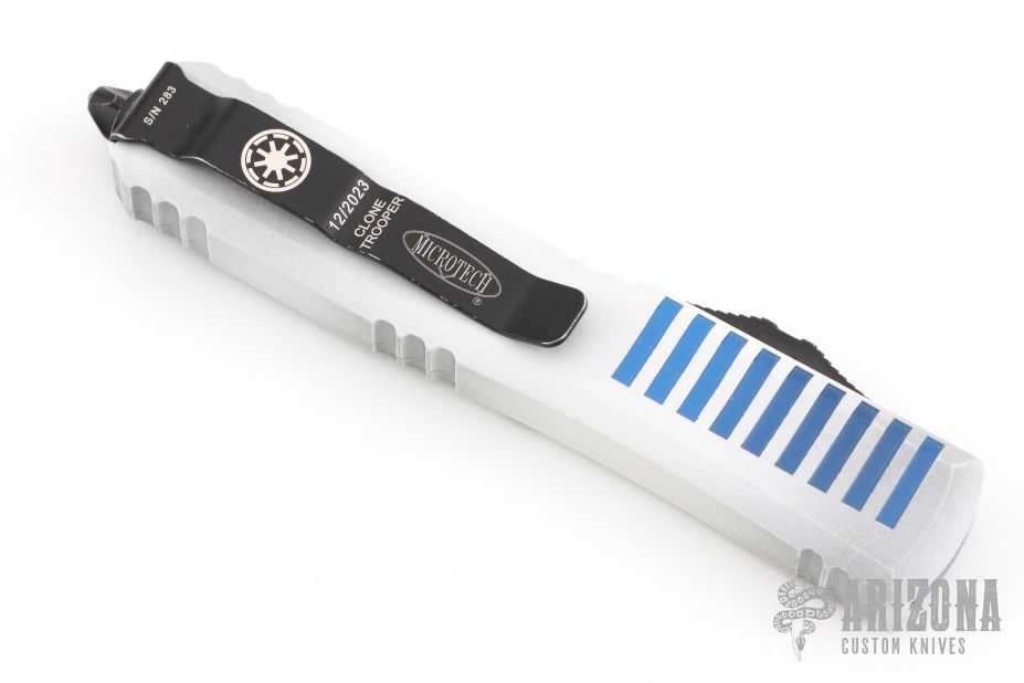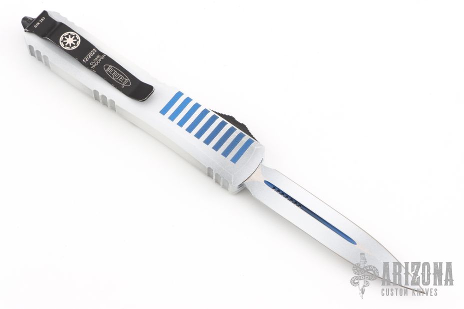 This Ultratech OTF automatic by Microtech features a D/E white blade. White and blue aluminum contoured frame with black tip down stainless steel clip. Dated 12/2023 and s/n 283. Has some minor wear on the edges of the clip, otherwise excellent condition. Includes original box and papers.