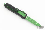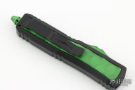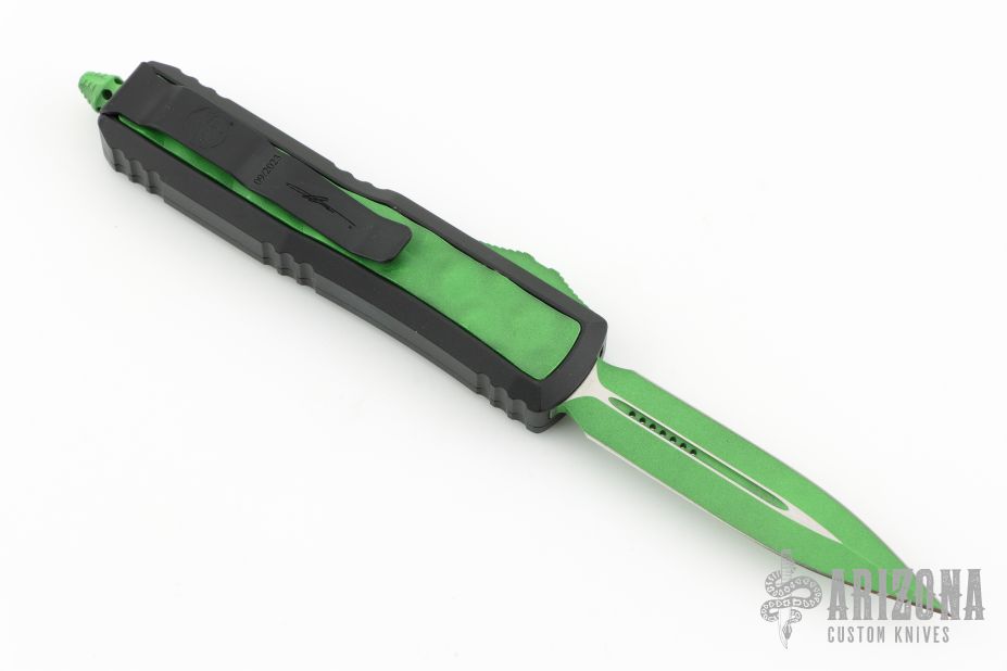 This Daytona by Microtech Knives features a two-tone finished blade with green bevels and satin flats.  The handle has green mamba bubble inlays, a black aluminum frame and a black steel tip down pocket clip. Comes with original box and papers. Dated 09/2023