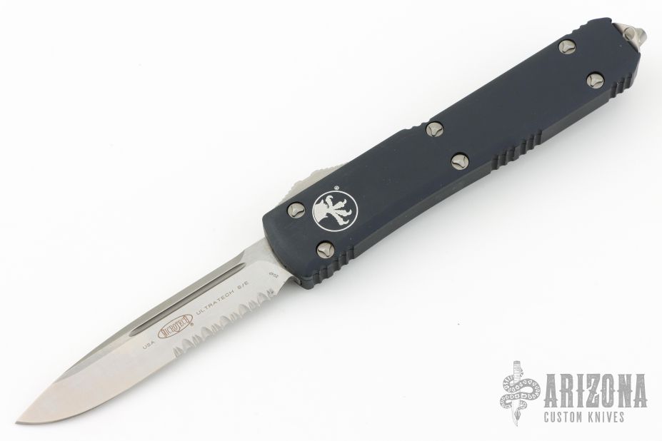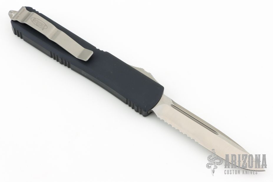 This Ultratech OTF automatic features a satin finished S/E drop point blade with a partially serrated edge and a black aluminum frame. Stainless steel clip. Glass breaker. Serial number 145525 and dated 04/2019. Excellent Condition. Comes with original box and papers.
